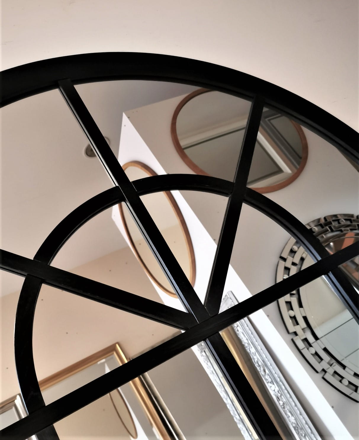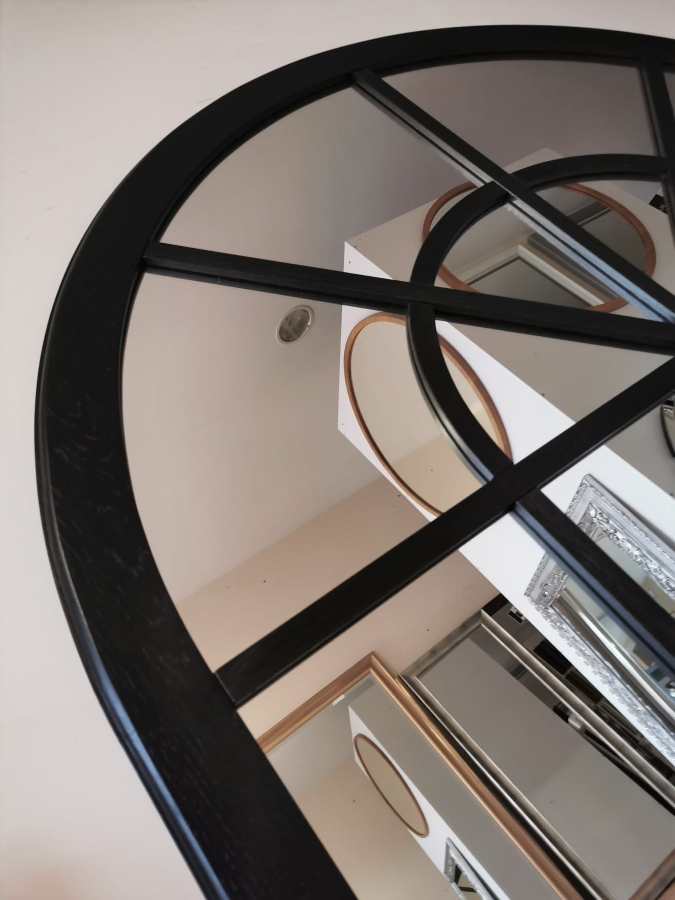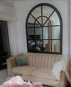 Eleganckie duże lustro dekoracyjne w kształcie łukowego okna.
