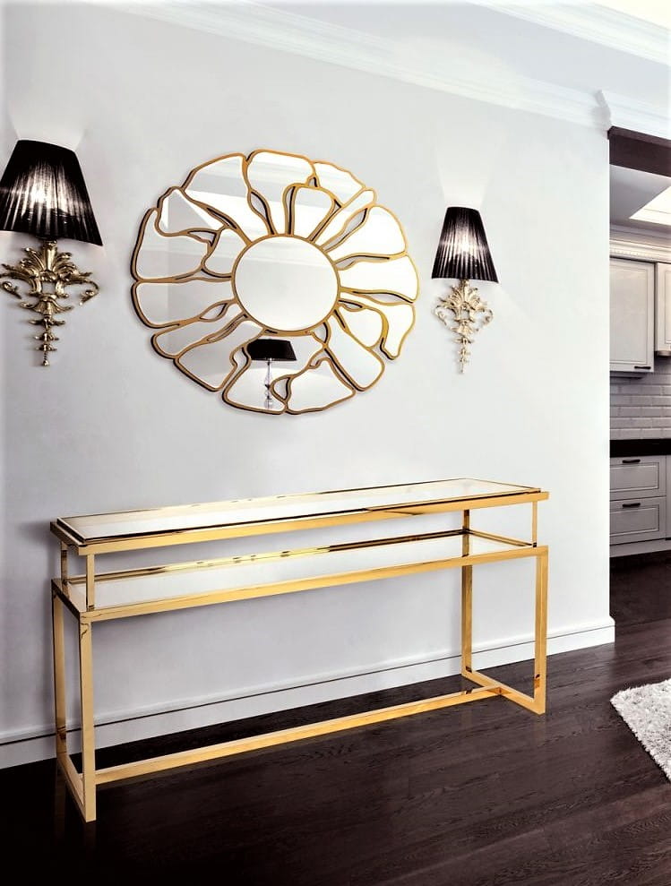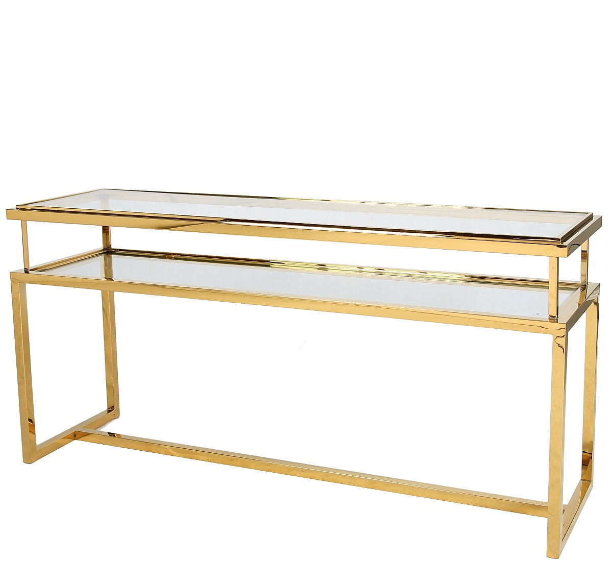 Nowoczesna, designerska konsola z linii produktów Janssen Gold, wykonana ze złotej stali nierdzewnej chromowanej i hartowanego przeźroczystego szkła (blat i półka).