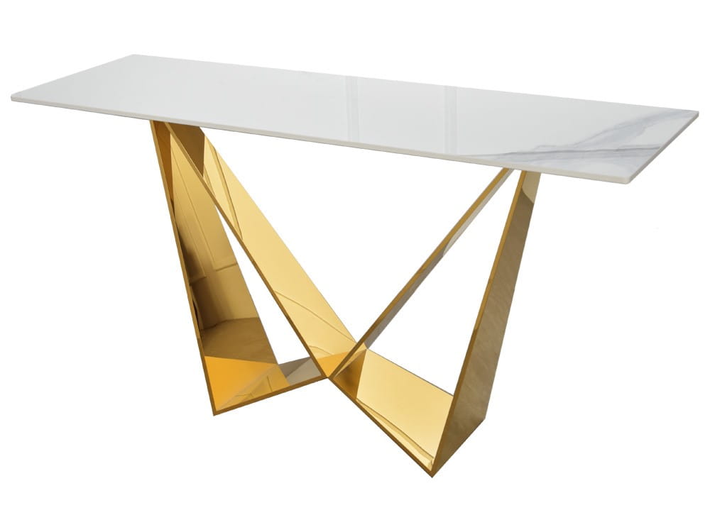 Elegancka konsola w nowoczesnej formie. Ten wyjątkowy mebel powstał z połączenia polerowanej stali nierdzewnej w kolorze złotym (podstawa) oraz marmuru w odcieniach bieli (blat).