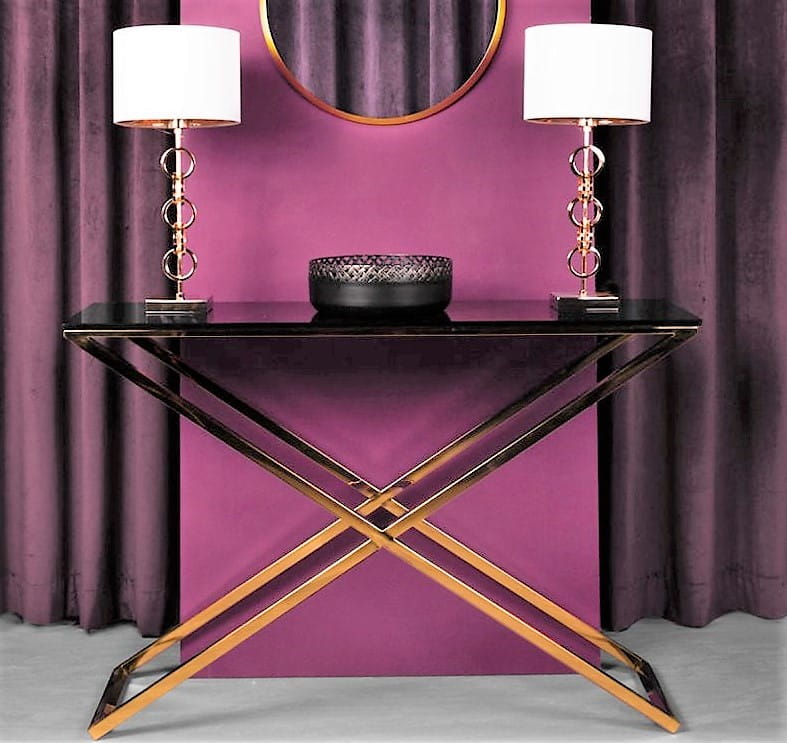 Nowoczesna konsola- toaletka, która powstała z połączenia czarnego szkła i złotej stali nierdzewnej.