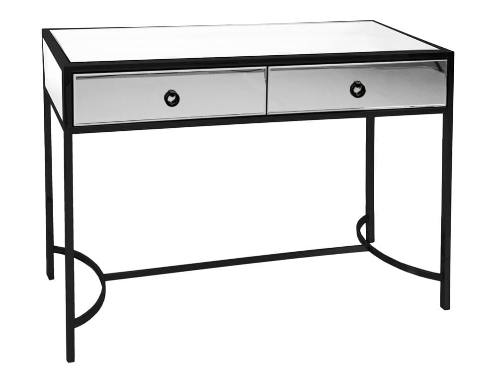 Prosta konsola wykonana z czarnej stali nierdzewnej i srebrnego kryształowego lustra. Mebel doskonale sprawdzi się w nowoczesnych, minimalistycznie urządzonych wnętrzach. Dobrze wkomponuje się w modny styl loftowy. Komoda posiada 2 wygodne szuflady z atrakcyjnymi uchwytami. Elementy lustrzane wykończone są szlifowaną fazą, co dodaje szyku i elegancji.