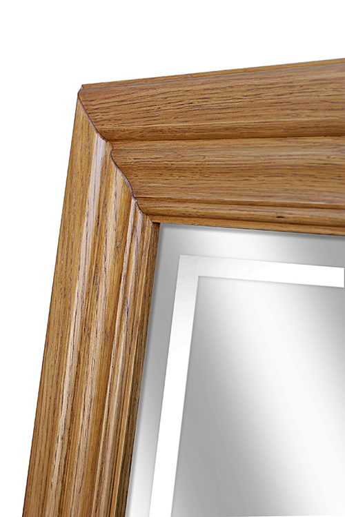 Lustro z podświetleniem LED oprawione w ozdobną frezowaną ramę wykonaną z litego drewna dębowego.