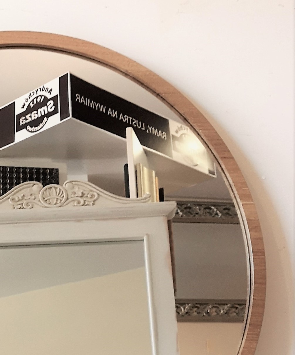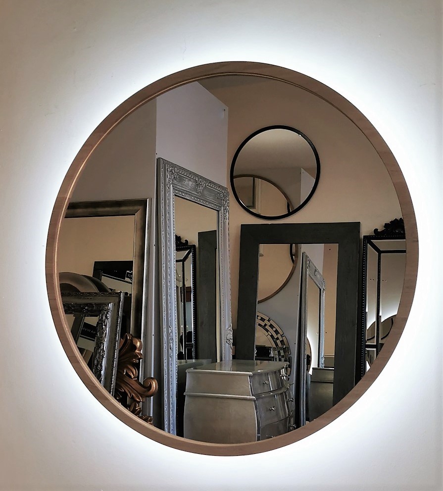 Lustro okrągłe z wąską ramą dębową i podświetleniem led 80x80