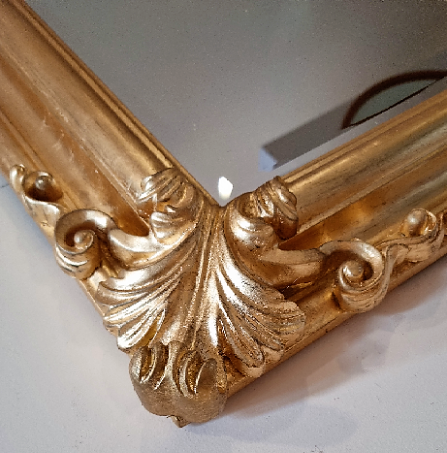 Rama wykonana jest z drewna i wykończona w kolorze złotym. Rama jest frezowana, a w narożnikach posiada dodatkowe zdobienia. Rama jest subtelnie postarzana za pomoca efektu przecierania. W środku umieszczono kryształową tafle lustra z ozdobną fazą. Lustro można zawiesić pionowo lub poziomo (zawieszki w komplecie).