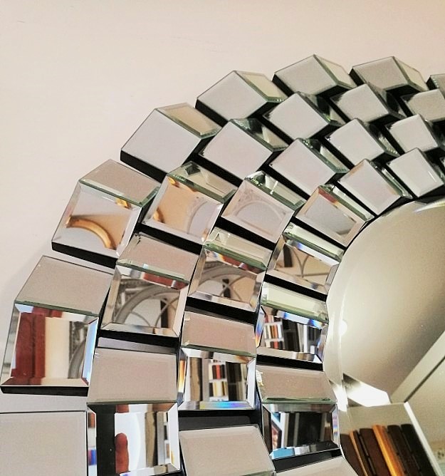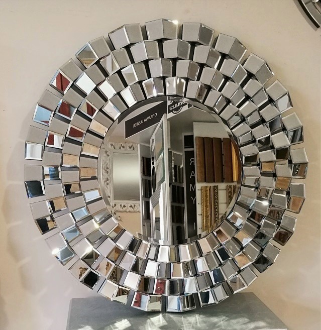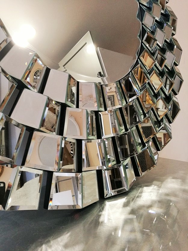 Piękne okrągłe lustro opasane ramą z dekoracyjnymi elementami kryształowego lustra.