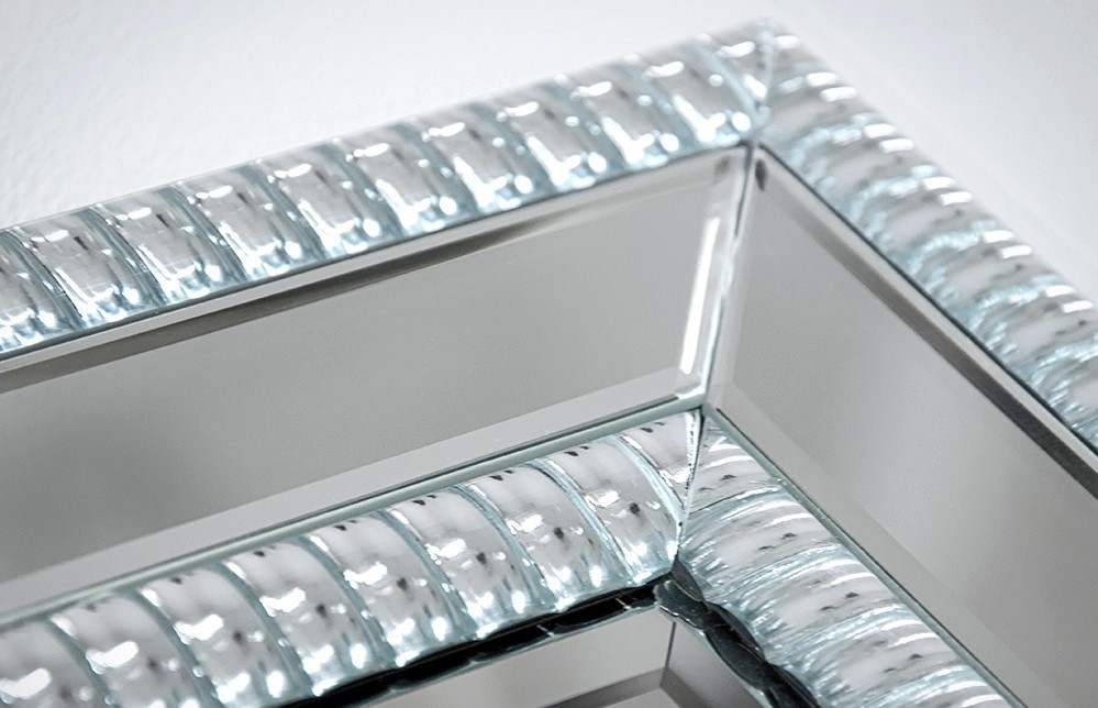 Rama lustra wykończona elementami lustra i szklanymi kryształkami.