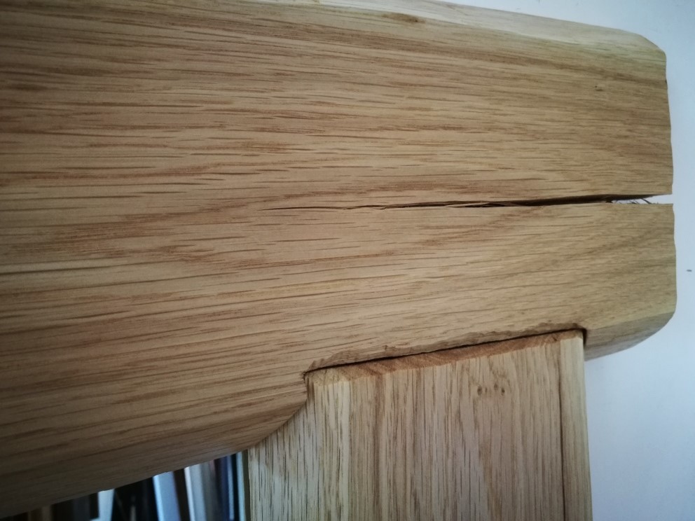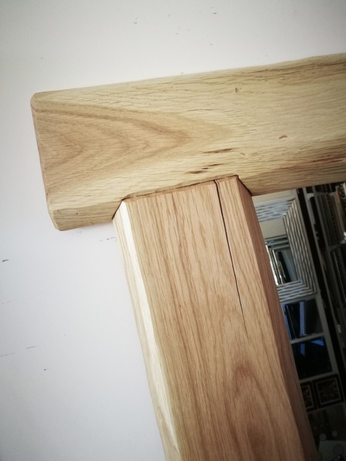 Ramę wykonano w całości z dębowych ręcznie ciosanych desek, które wykończono półmatowym olejem.