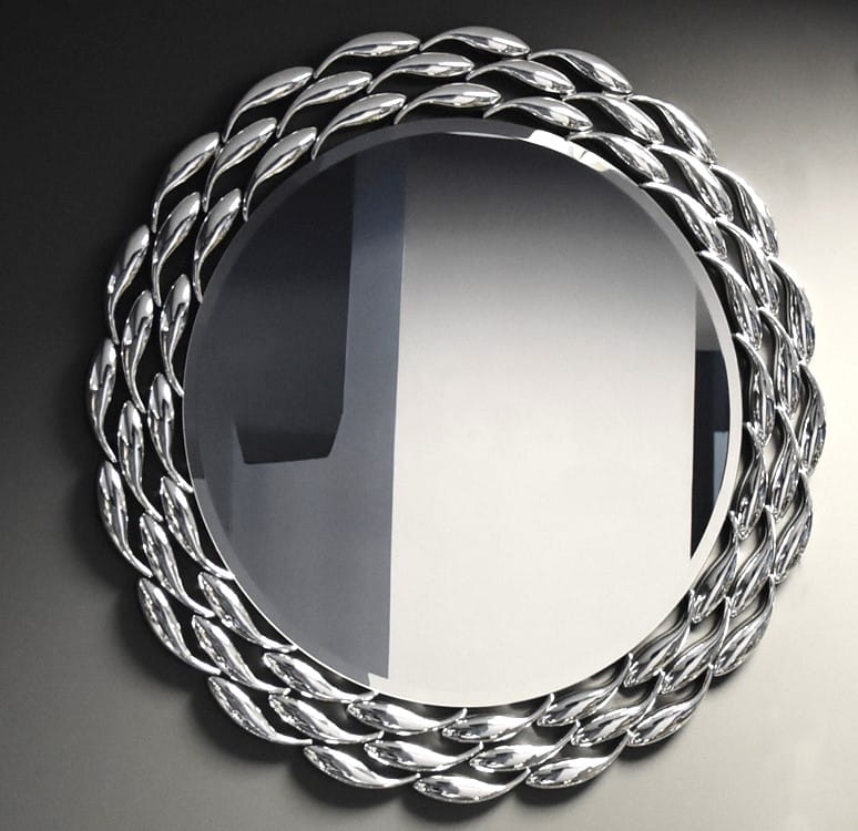 Okrągłe lustro w pięknie zdobionej ramie.
