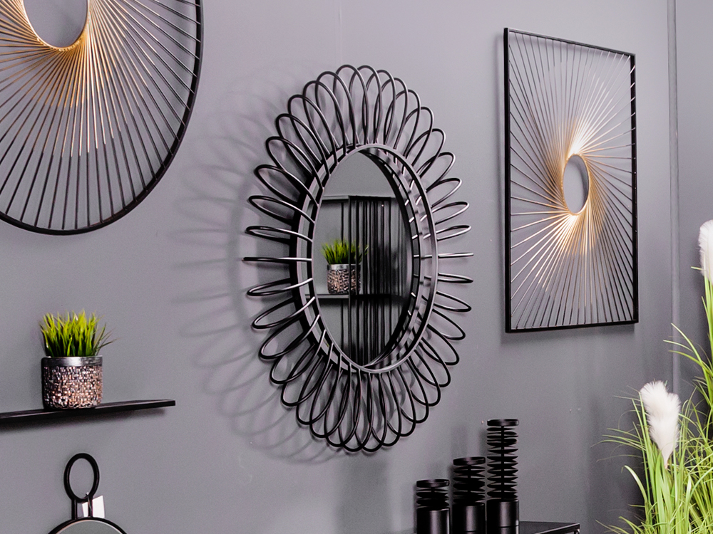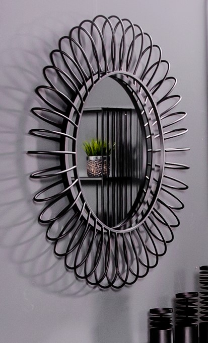 Okrągłe, czarne lustro otoczone stalową giętą ramą delikatnie przypominającą promienie słoneczne.