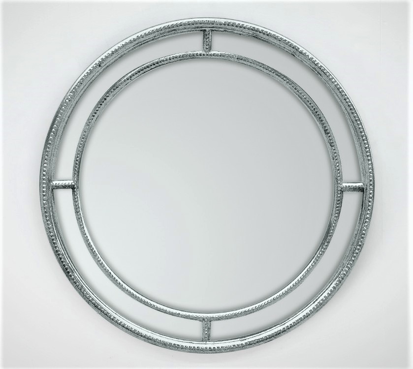 Okrągłe lustro z ramą ażurową wykonaną z drewna i wypełnioną kryształowym lustrem.