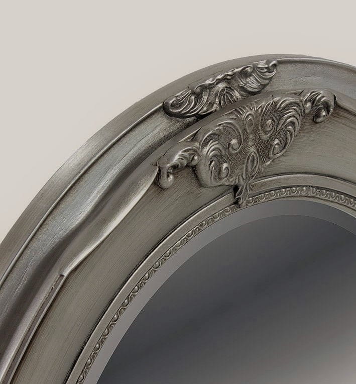 Kryształowa tafla lustra z fazą została oprawiona w piękną stylową ramą. Rama wykonana jest z drewna i wykończona w kolorze srebrnym. Lustro przeznaczone jest do użytku we wszystkich pomieszczeniach, także w łazienkach.