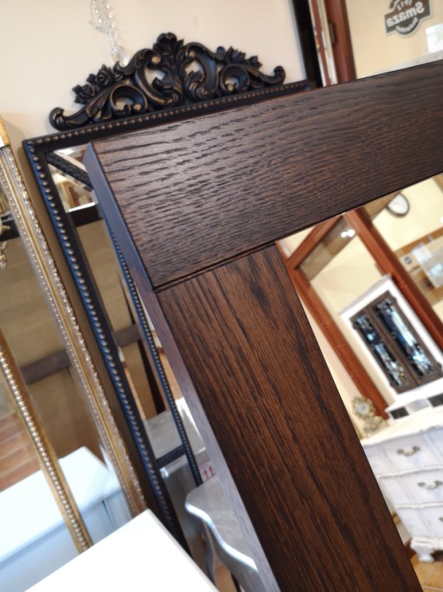 Wykończenie ramy w kolorze ciemny orzech nr 6 z wzornika (na indywidualne zamówienie istnieje możliwość wykonania tego modelu lustra z ramą w pozostałych kolorach z zamieszczonego wzornika).