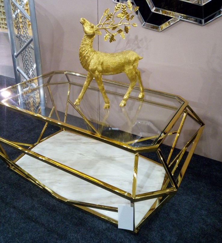 Designerski stolik kawowy, który powstał z połączenia złotej stali nierdzewnej, białego marmuru i przeźroczystego szkła.