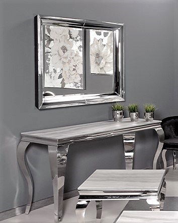 Podstawa konsoli wykonana ze srebrnej stali nierdzewnej polerowanej.