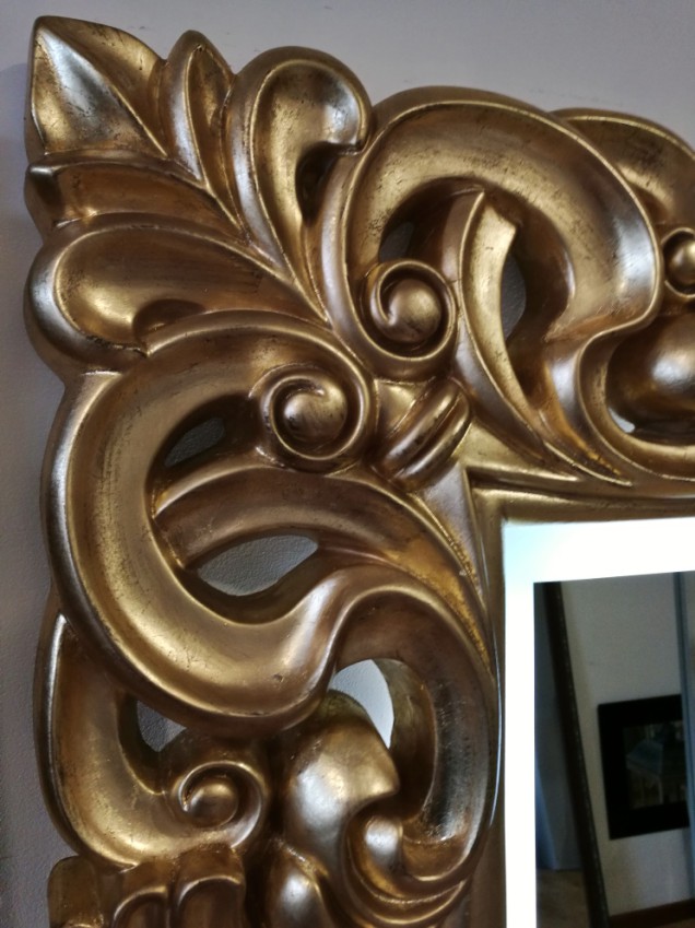 Rama lustra jest ażurowa, wykonana ze specjalistycznej żywicy ramiarskiej i ręcznie wykończona złotym szlagmetalem (technika pozłotnicza).