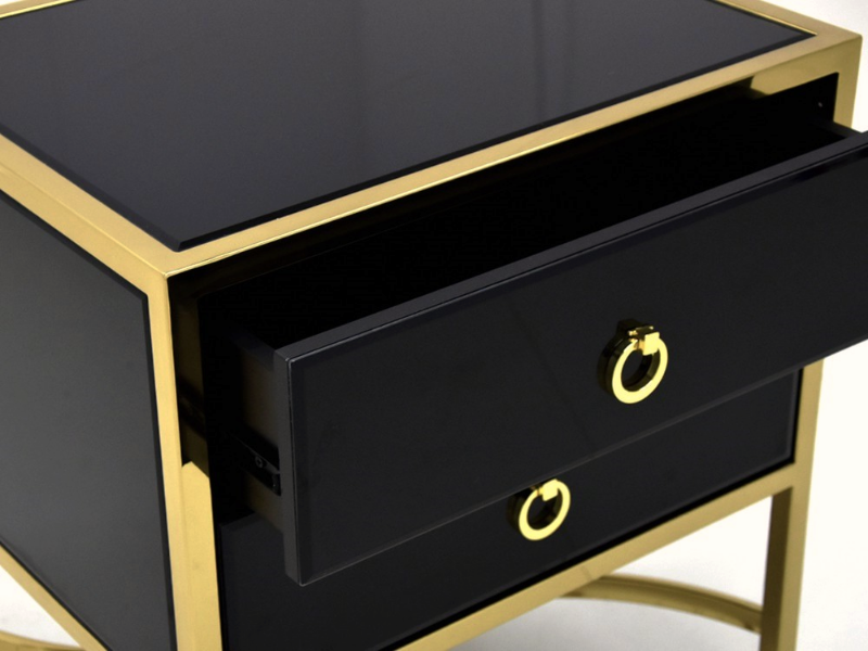 Stylowa szafka nocna, która powstała z połączenia fazowanego czarnego szkła i złotej stali nierdzewnej. Najnowsze trendy w aranżacji wnętrz, polegające na zestawieniu modnych kolorów z jednoczesną prostotą formy. Szafka posiada 2 pojemne szufladki z ładnie dopasowanymi złotymi uchwytami.