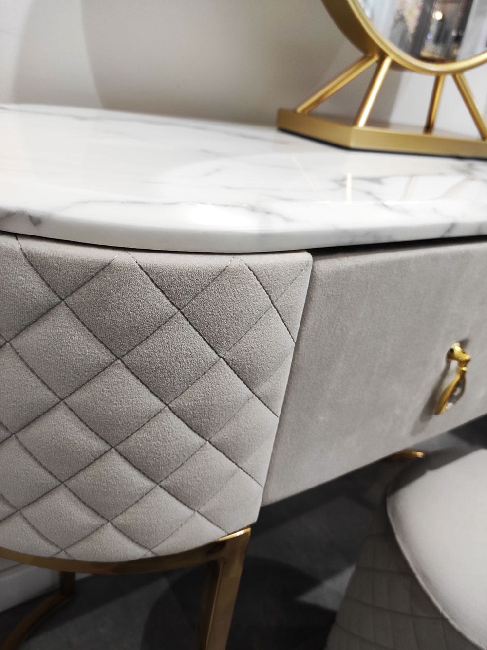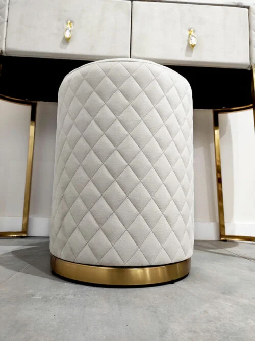 Wyszukana i bardzo elegancka toaletka z wygodną pufą w komplecie. Te wyjątkowe meble mają podstawy ze złotej stali nierdzewnej. Wykończone są miękkim welurem w szarym odcieniu. Toaletka ma biało szary blat z syntetycznego marmuru. Toaletka posiada 2 szuflady. Meble są bardzo solidne, jednocześnie wyglądają niezwykle lekko. Doskonała propozycja do sypialni urządzonej w stylu glamour i nie tylko.