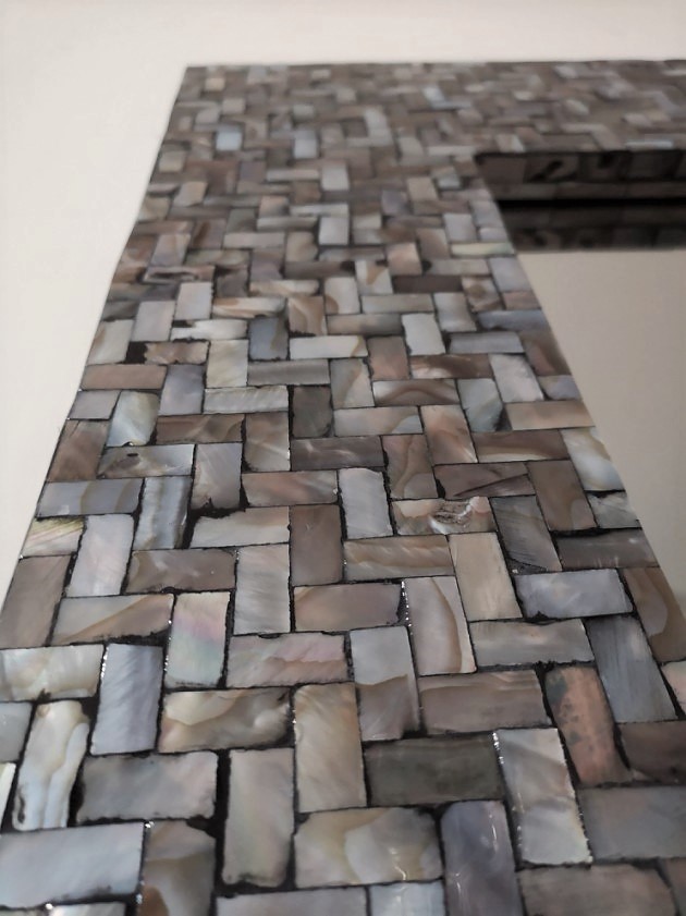 Rama lustra kwadratowa, ręcznie wykończona elementami artystycznego szkła w odcieniach szaro- beżowych.