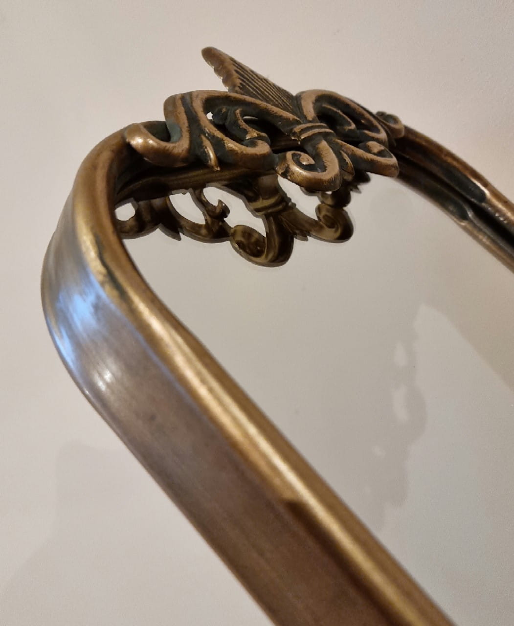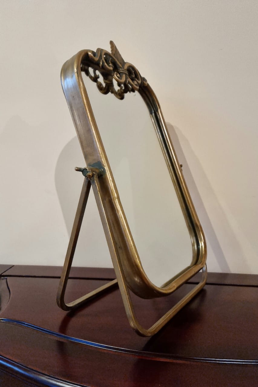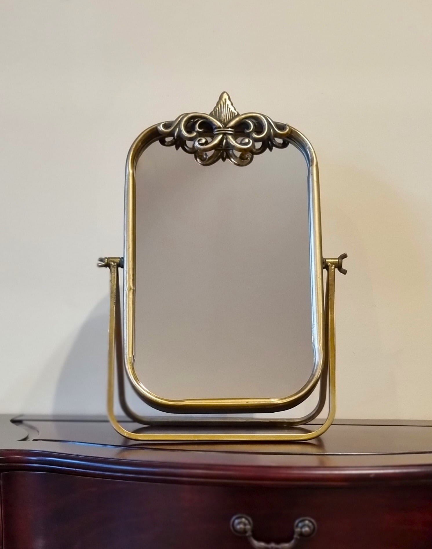 Niewielkie urocze lusterko w ozdobnej metalowej ramie. Rama posiada stylizowane elementy dekoracyjne i jest wykończone w kolorze postarzanego złota. Lusterko posiada stabilną podstawę, którą można regulować pod kątem. To ładne lusterko mozna postawić na komodę, gdzie będzie pełnić dekoracyjną funkcję. Lusterko można używać do celów kosmetycznych.