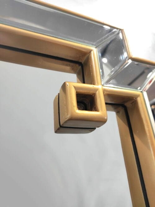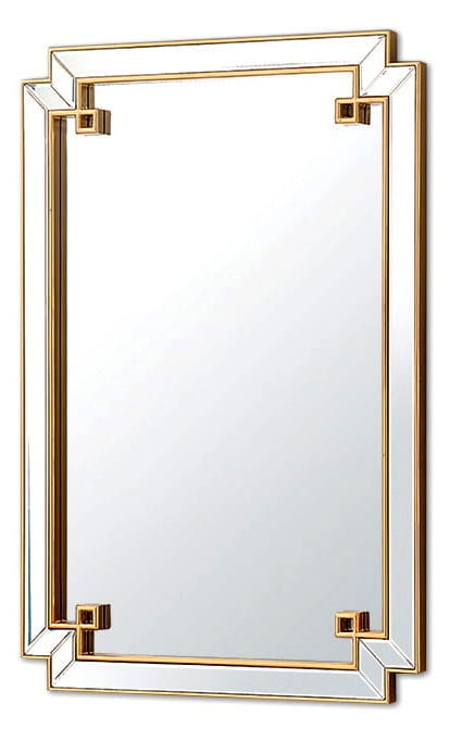 Prostokątne lustro do zawieszenia na ścianie. Oryginalny kształt i elegancki wygląd to główne cechy tego produktu. Zdobienia w postaci modnych złotych ramek dodają walorów dekoracyjnych. W części ramowej osadzono kryształowe elementy lustrzane z odobnym fazowaniem.