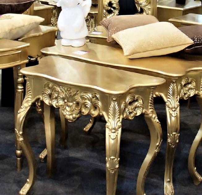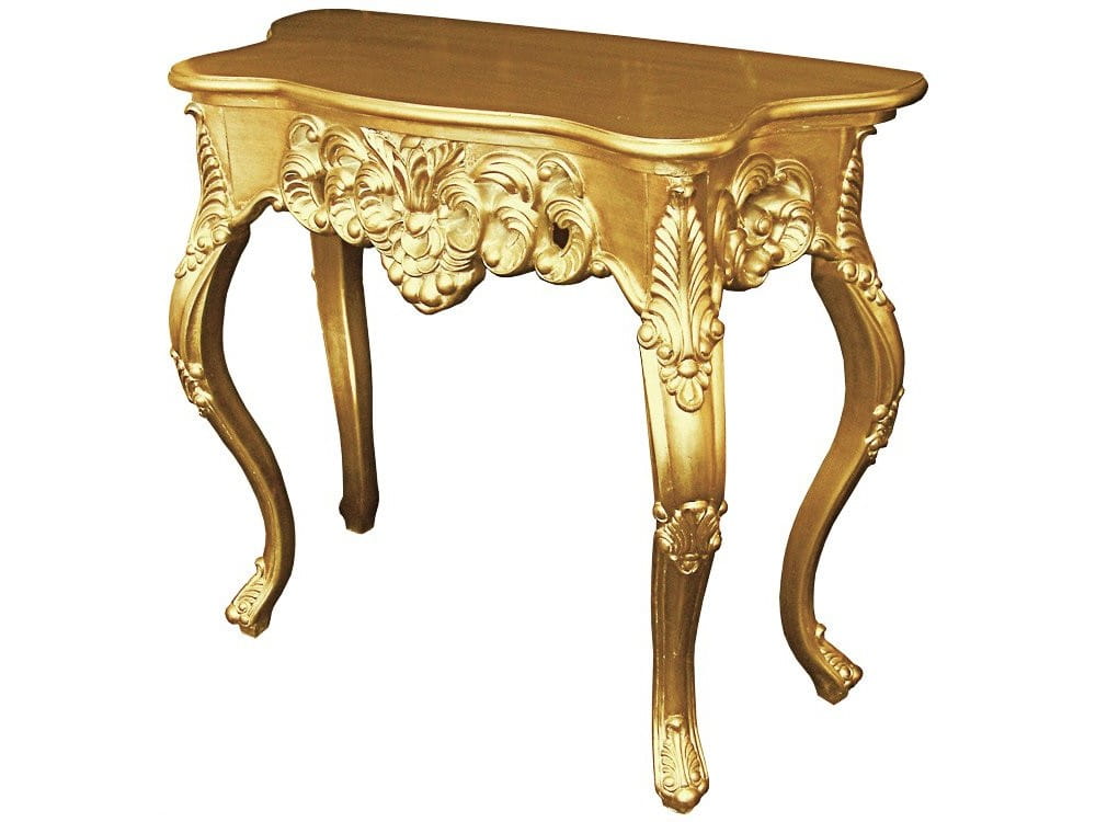 Złota stylizowana konsola. Mebel wykonany jest z drewna i żywicy ramiarskiej. Cała konsola wykończona jest złotym szlagmetalem. To doskonała propozycja do wnętrz urządzonych w stylu barokowym, ale świetnie sprawdzi się również w innych pomieszczeniach.